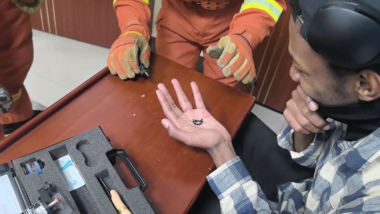 消防员观察发现,一枚金属戒指紧紧卡在该留学生无名指关节处,因佩戴时间较长,手指已明显肿胀。